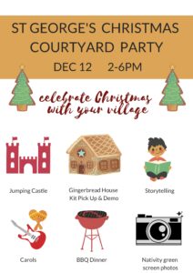 Drop by on Sunday afternoon December 12th from 2-6pm to enjoy the St George’s Courtyard Christmas Party!